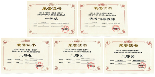 近日,安徽省教育厅公布2021年“新时代新思想•新青年”安徽省大学生学习马克思主义理论成果大赛评审结果,全省共评出一等奖19个、二等奖41个、三等奖55个,共计115件作品获奖。我校马克思主义学院研究生袁华、苗智慧、廖玉林、余洋四名同学分别获得一等奖1项、二等奖3项的好成绩。