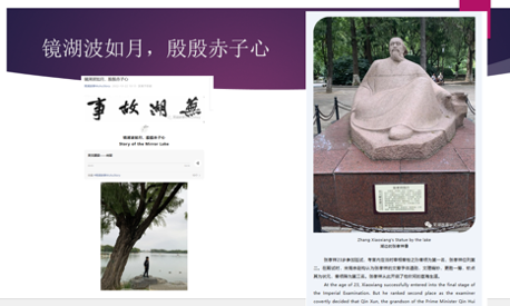 我们写镜湖,也不是写镜湖的美景,而是写南宋状元张孝祥的故事。张孝祥因主张抗金被罢官回到家乡芜湖,看到江边的百姓生活劳苦,高处的田地遭受旱灾,低处的田地遭水灾,于是把家里的良田百亩捐献出来,蓄水成池,造福百姓,后取名“陶塘”,效仿陶渊明的低调。这是一种家国情怀,所以我们文章的题目叫“镜湖波如月,殷殷赤子心”。通过这个故事我想告诉学生,我们为什么要投入这么大精力来写“芜湖故事”?是因为我们也和张孝祥一样,也对家乡怀有一份赤子之心。