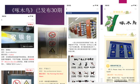 《啄木鸟》平台创办于2022年5月20日,主要是对城市生活中出现的公示语翻译错误进行纠错。平台短小精悍,更新频率快,目前已发布34期,主要是由本科生同学在运作。推文要求是尽量真实拍摄的图片,然后根据译写规范进行修改。平台产生的一个意想不到的效果就是现在每个团队成员都变成“啄木鸟”,走到哪都会盯着人家的标牌看上一会儿,看看有没有英文,有没有翻译错误,培养了学生细心观察的好习惯。